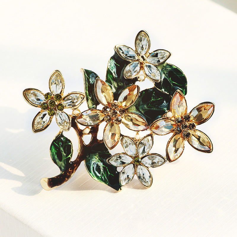 Champagne Gold Floral Brooch – Crystal Flower Pin with Enamel Detail