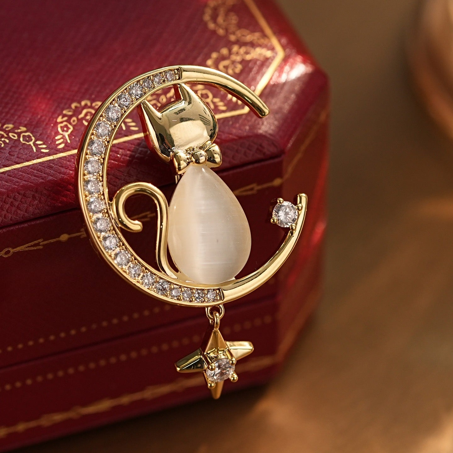 Personality trend Small fresh light luxury High-end diamond-encrusted moon star cat brooch Anti-light corsage