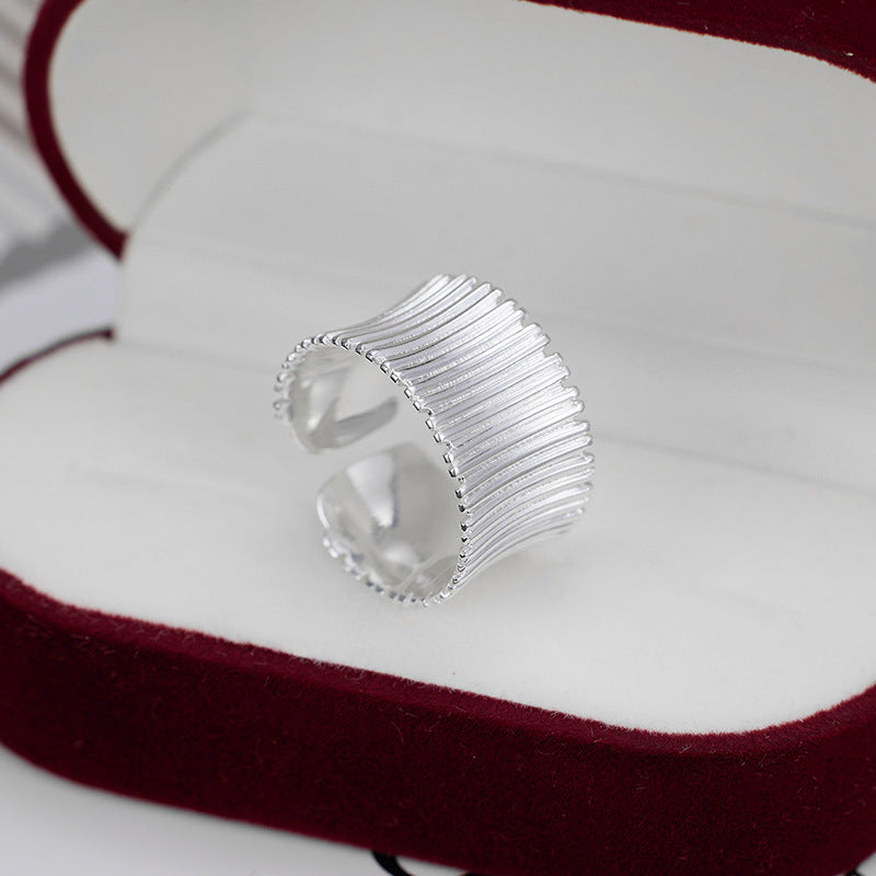 Ring Women's Premium Niche Design 925 Sterling Silver Folded Wide Face Geometric Stripe Opening Adjustable Ring