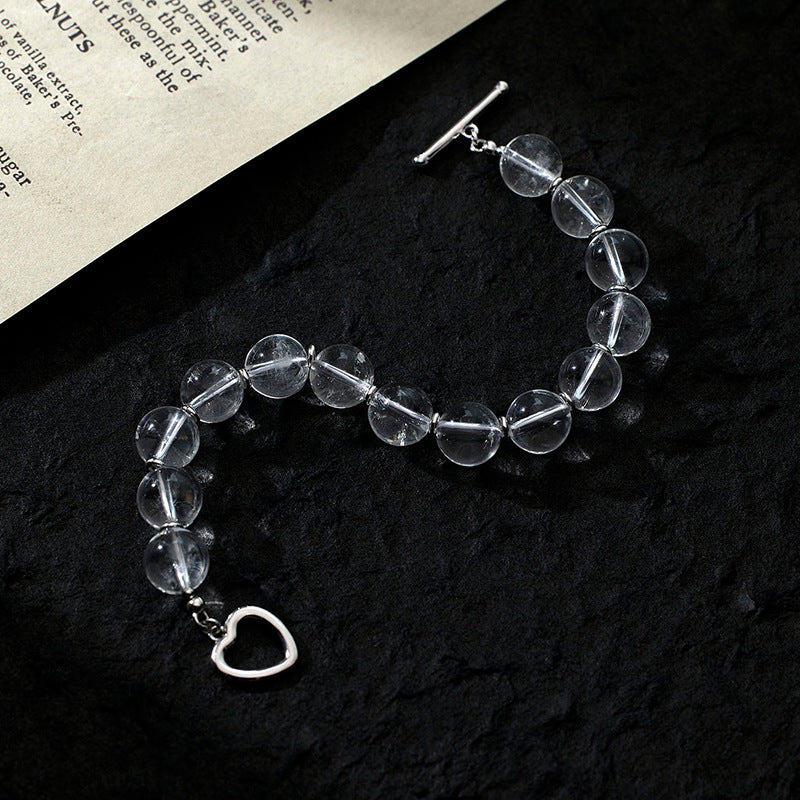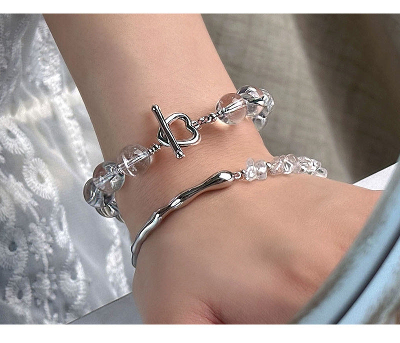 S925 sterling silver bracelet women's niche design, cold temperament, fashionable natural white crystal round bead love OT buckle bracelet.